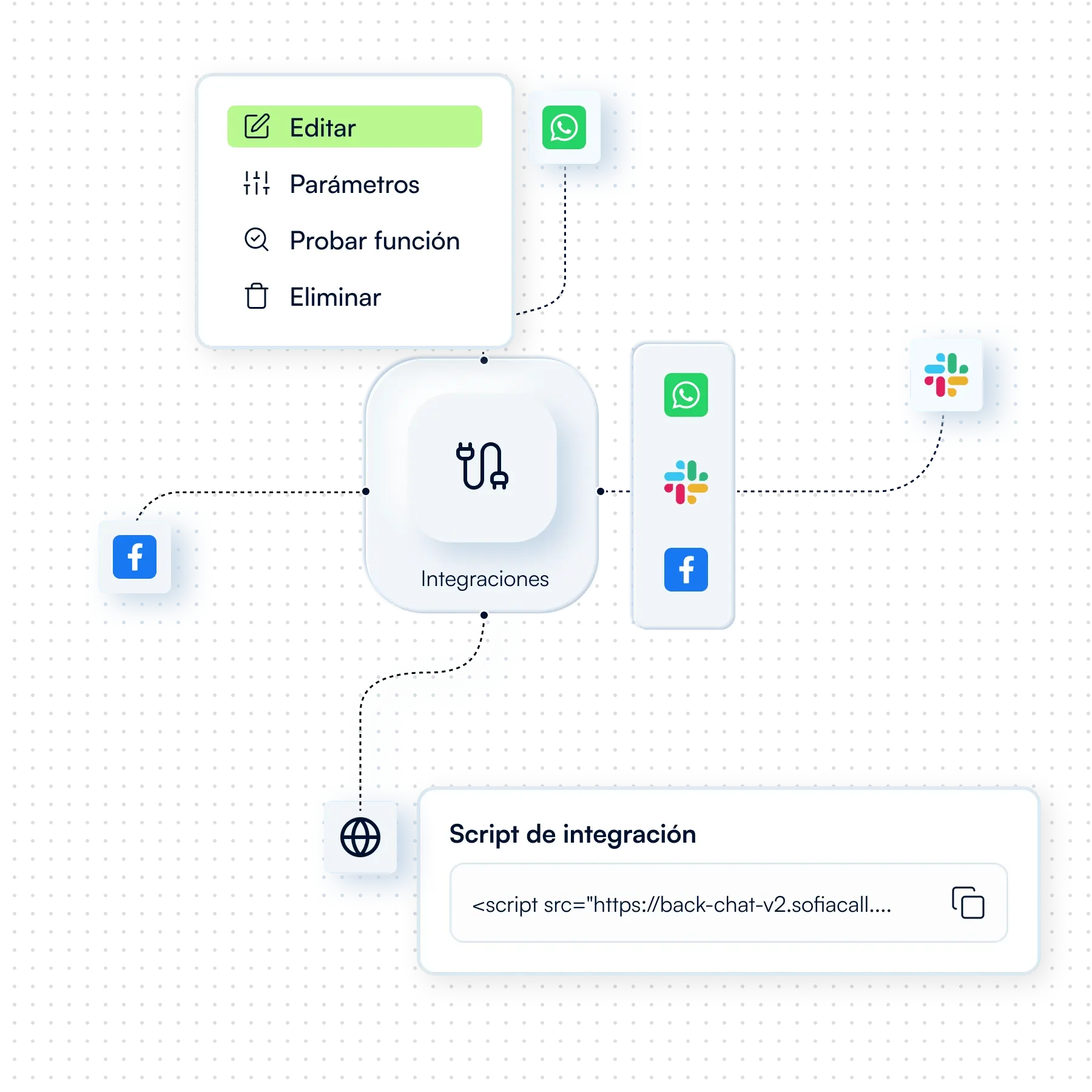 Integra SOF.IA CHAT con tu sitio web, WhatsApp, redes sociales y más. Configura respuestas automáticas y flujos de conversación.